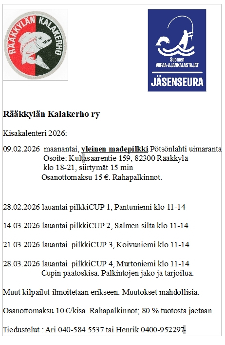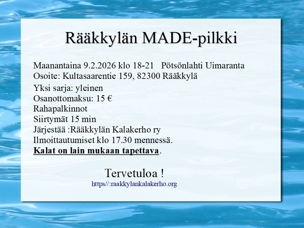 Tervetuloa Rääkkylän Kalakerho ry:n kotisivuille! Yhdistyksemme on omistautunut edistämään kalastusta, ulkoilua ja yhteisöllisiä tapahtumia Rääkkylän alueella. Järjestämme säännöllisesti tapahtumia ja kilpailuja, jotka tuovat harrastajat yhteen. Liity mukaan nauttimaan luonnon rauhasta ja aktiivisesta seuratoiminnasta! Ota yhteyttä täyttämällä yhteydenottolomake, niin vastaamme mielellämme kysymyksiisi.